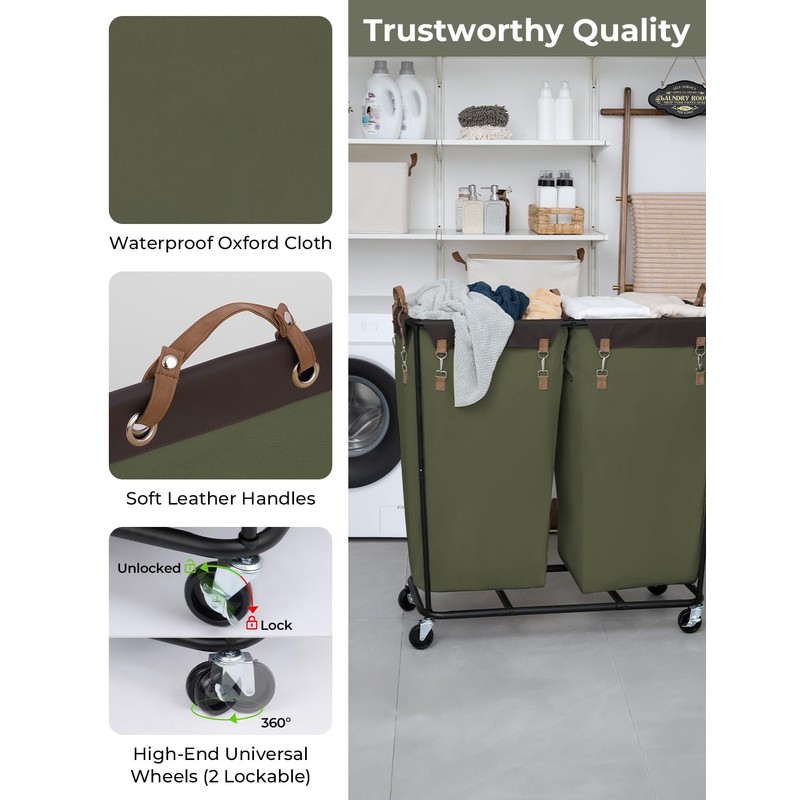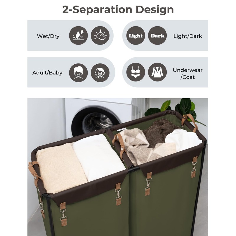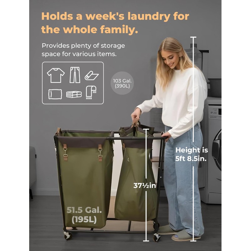 StorageWorks 390L Extra Large Lanudry Hamper with Wheels, 2 Sections Laundry Basket with Wheels, Clothes Sorter Cart with Divider for Hotel, Home, Green, 37.75"L x 17"W x 37.5"H