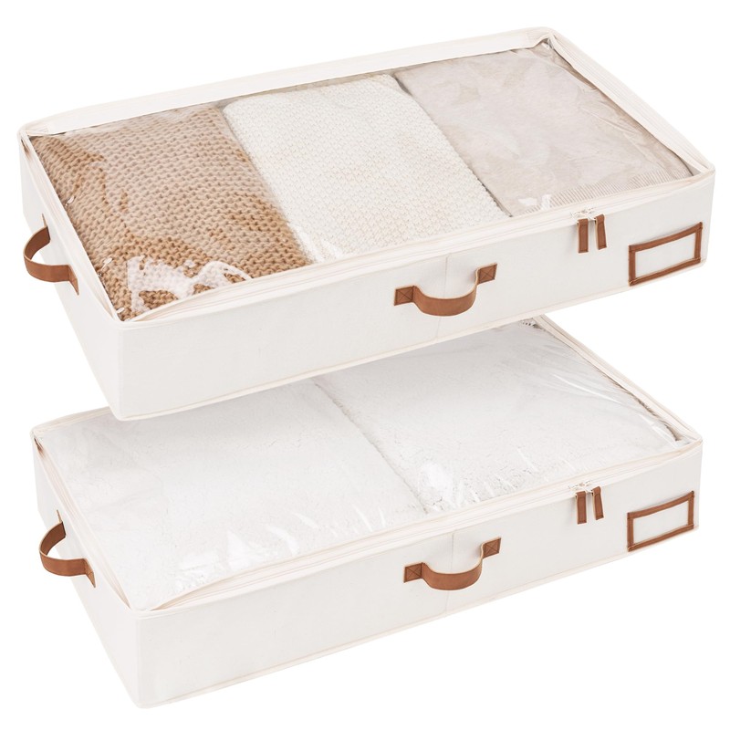 - Underbed storage box featuring thick PU handles on 3 sides for easy accessing, carrying, and retrieving.