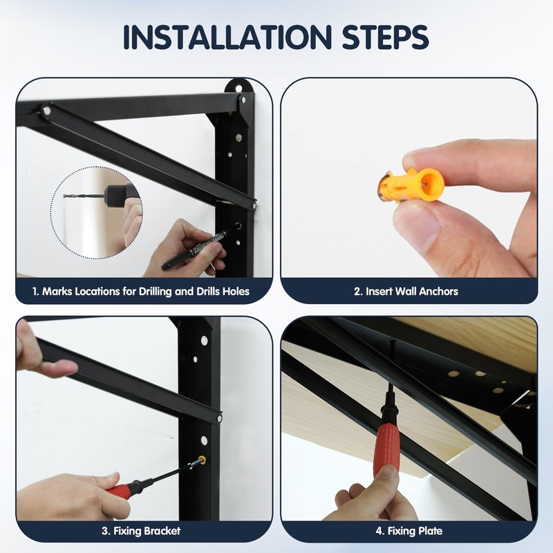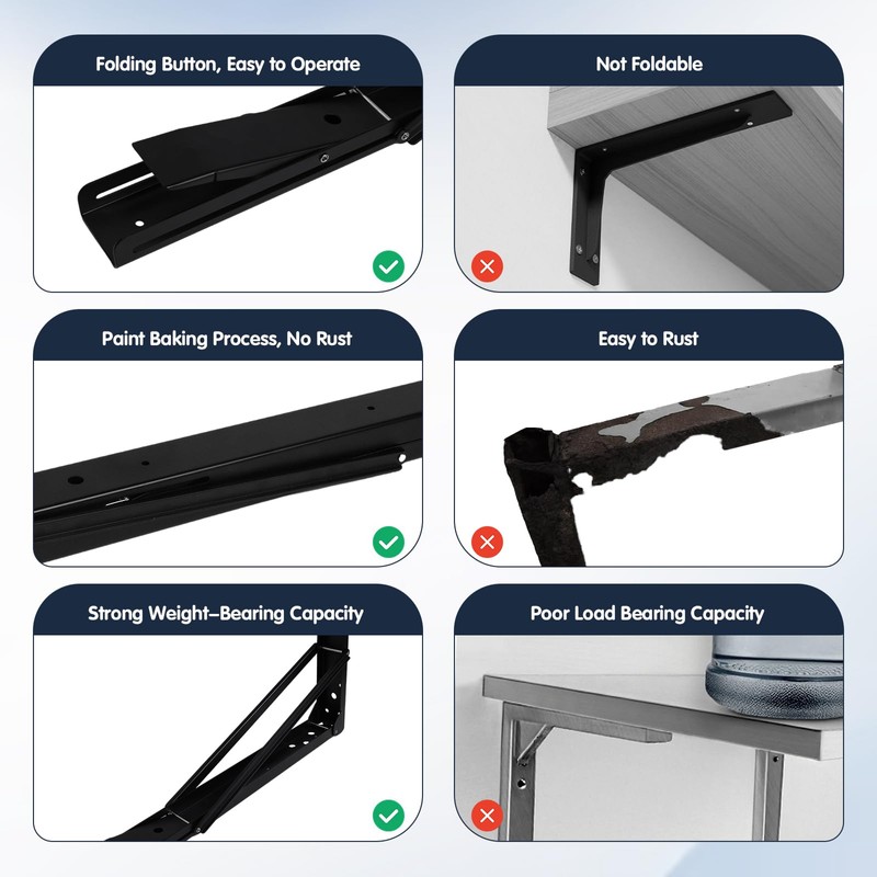 - Easy to install: Folding shelf brackets are equipped with hardware mounting accessories and no additional accessories are required. Make sure the two brackets are parallel to each other, perpendicular to the wall, and easy to install