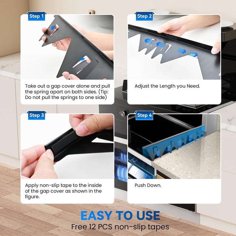- Distinctive Design: Includes 4 pcs stainless steel gap fillers and 12pcs silicone strips. Which with a telescoping design that seamlessly fits various stovetop and oven gaps, enhancing both functionality and aesthetics in your kitchen