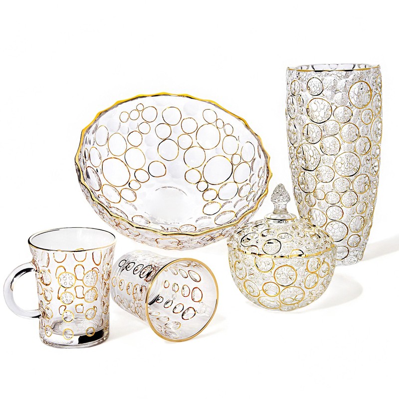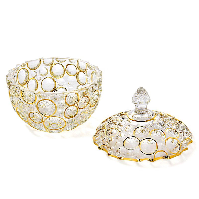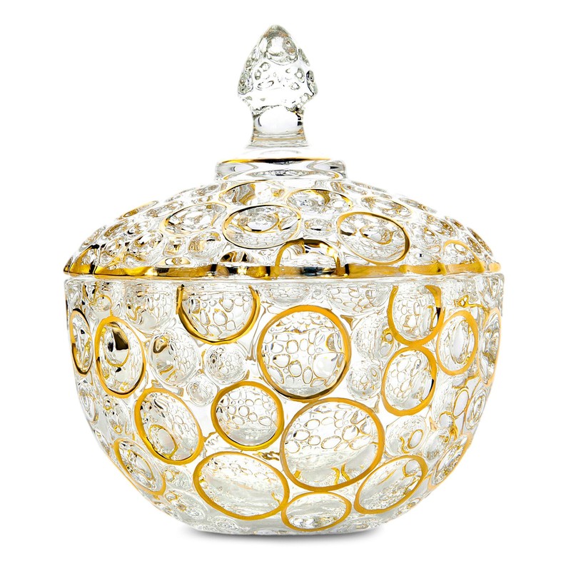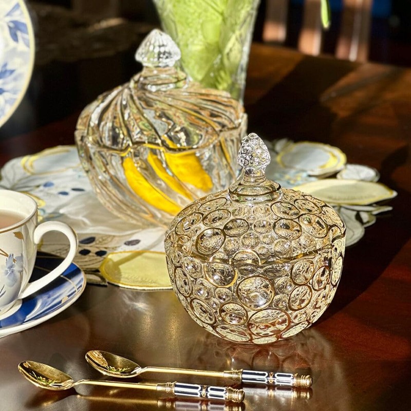 - Material glass Bohemian style Luxury Hand-painted Glass Candy Jar - a playfully sparkling glass jar, fully crafted by hand in the Bohemian Style. The most unique feature of the jar is that when light is reflected upon it - it creates a magically playful gold kaleidoscope pattern of light, with designs and patterns shifting with each turn of the jar!