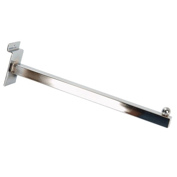 • The straight arm for slatwall is designed to be used with medium to heavy weight objects and are ideal for clothing and fashion accessories. This 300mm straight arm for slatwall is manufactured from 19mm square tube and has a chrome plated finish.