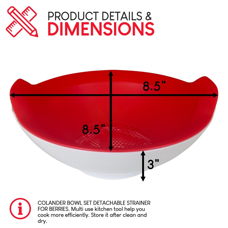- Red colander and white bowl 2 in 1 set, multi use kitchen tool; Helps you cook more efficiently; Designed for families on the go, it's great for making a salad, draining fruit, vegetable, pasta, and more