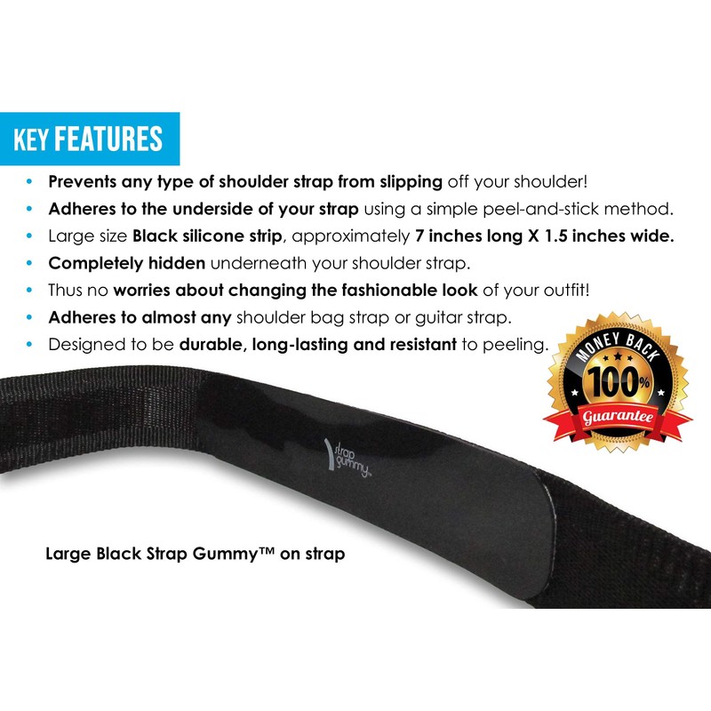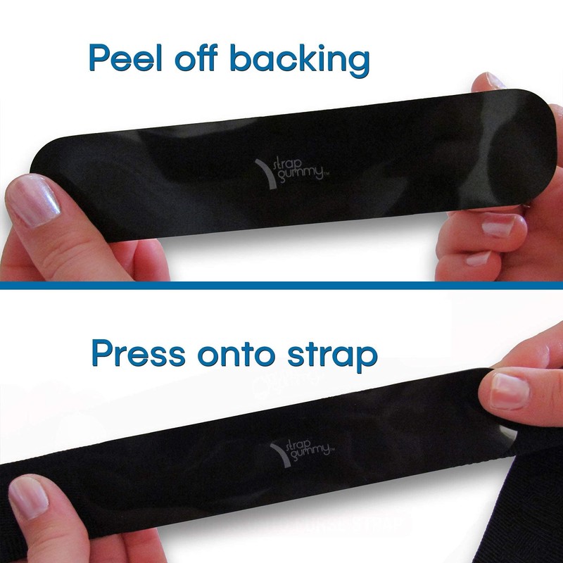 - 🔹Strap Gummy is designed to be durable and resistant to peeling off the shoulder strap.. It adheres to the underside of the strap using a simple peel-and-stick method; easily removes from strap surface if you desire; assembled in the U.S.A.