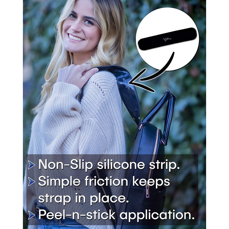 - Simple friction keeps your straps in place on your shoulder! The strips are specially designed and manufactured with a high coefficient of friction to prevent all types of straps from slipping off your shoulder.