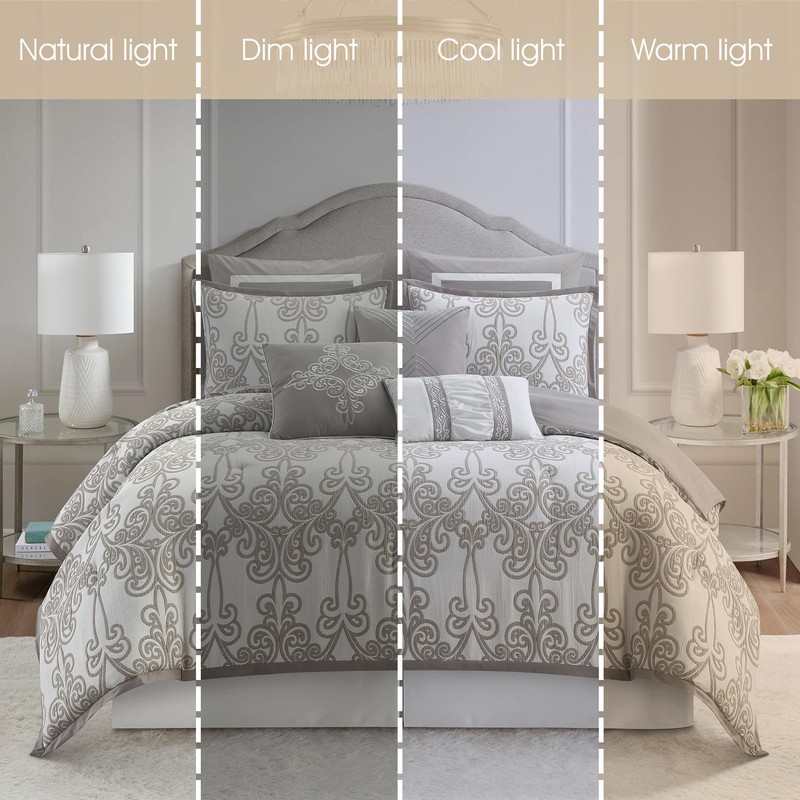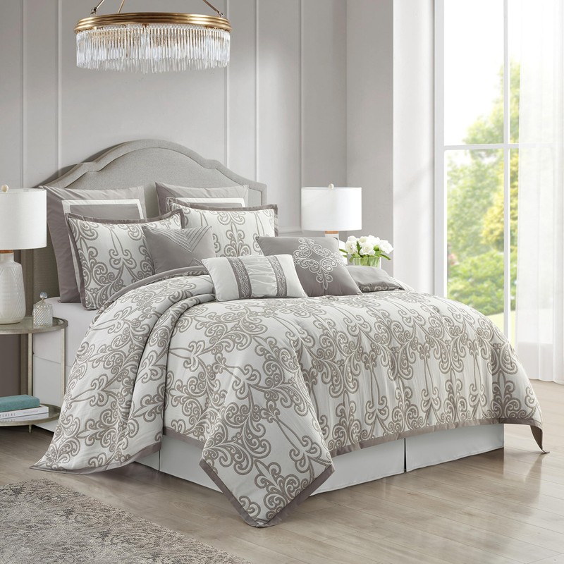 Stratford Park Smoke Grey Comforter Set Queen Size, 9 Piece Jacquard Floral Bedding Set, All Season, Ultra-Soft, Matching Pillows & Shams, Bed Skirt