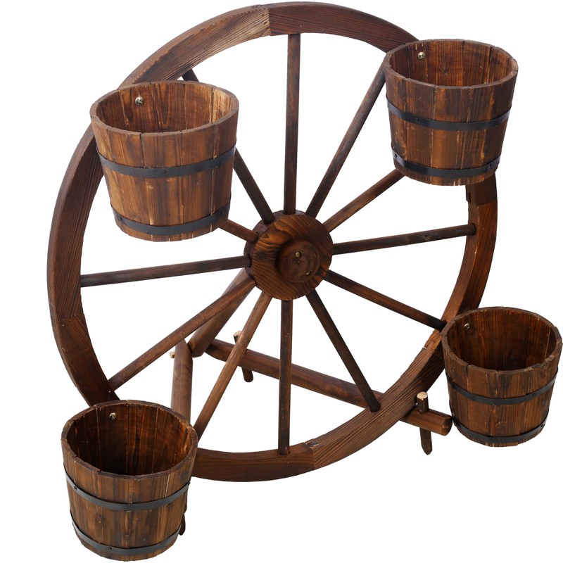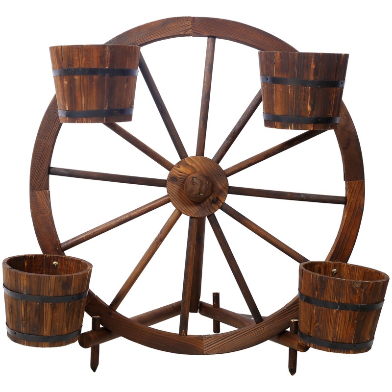 - Featuring a unique wagon wheel barrel design, this planter adds rustic charm and character to your porch, patio, or garden.