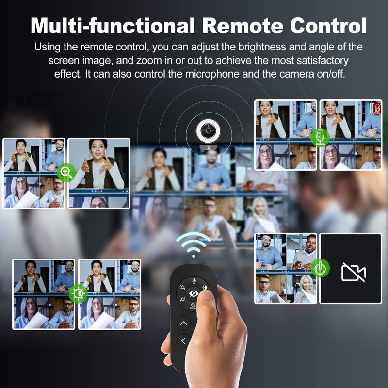 • Zoomable Webcam with RF 360° Omnidirectional Remote Control Control your video calls with one remote control, so even you are away from the desk, you are still charged. Supports video call side zoom in and out function, screen angle adjustment, video brightness adjustment, one key voice switch, supports remote control to close the screen. Adjust the brightness of the web camera in Mac OS Windows without any software, which is a great convenience for Mac users.