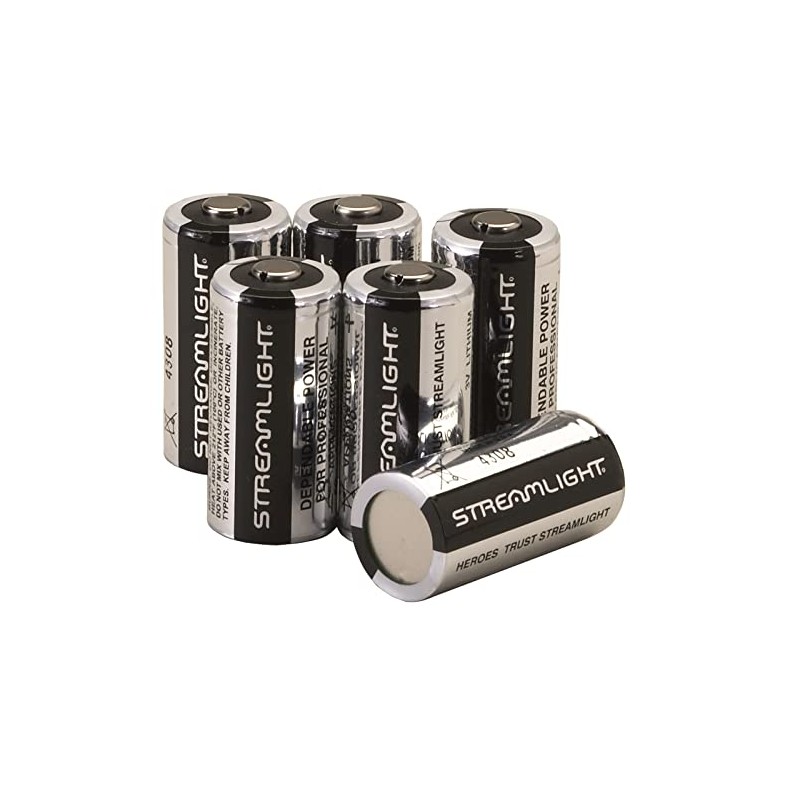- A 6-pack of non-rechargeable Streamlight CR123A lithium 3-volt batteries