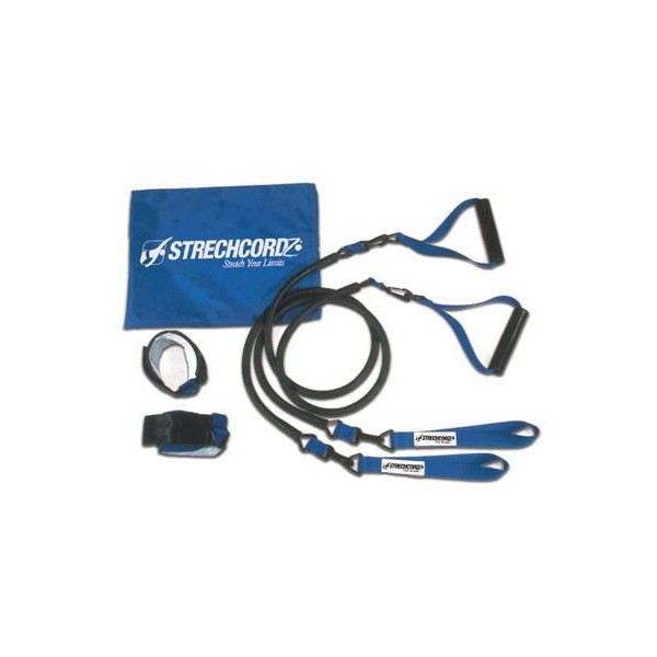 The Stretchcordz Mini Modular Set comes with a carry bag containing one pair each of handles and adjustable leg straps and two 3ft/90cm tubes with attached mounting straps and clips. Interchangeable. Replacement and additional parts available. Available in five resistance levels.