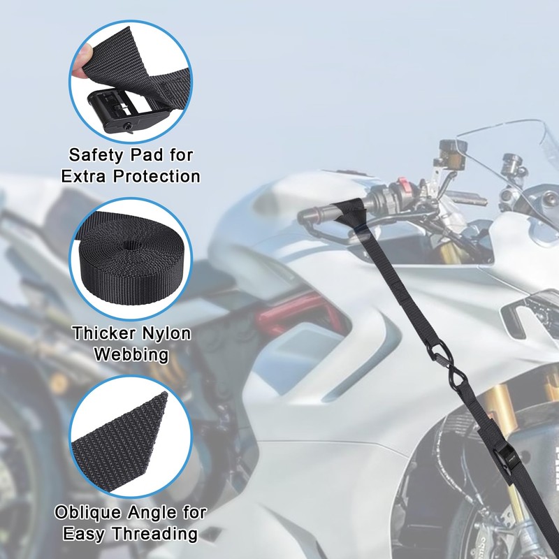 - Scratch-Free Safety Pad. Nylon webbing pad under the cam buckle shields your vehicle from friction damage. A must-have for scratch-free motorcycle transport