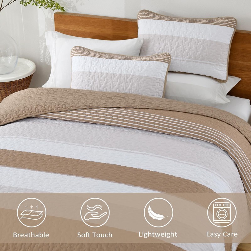 taupe/khaki Striped King Size Quilt Set is not just about looks. king size quilts for bed is also designed to keep you warm and comfortable during all seasons.