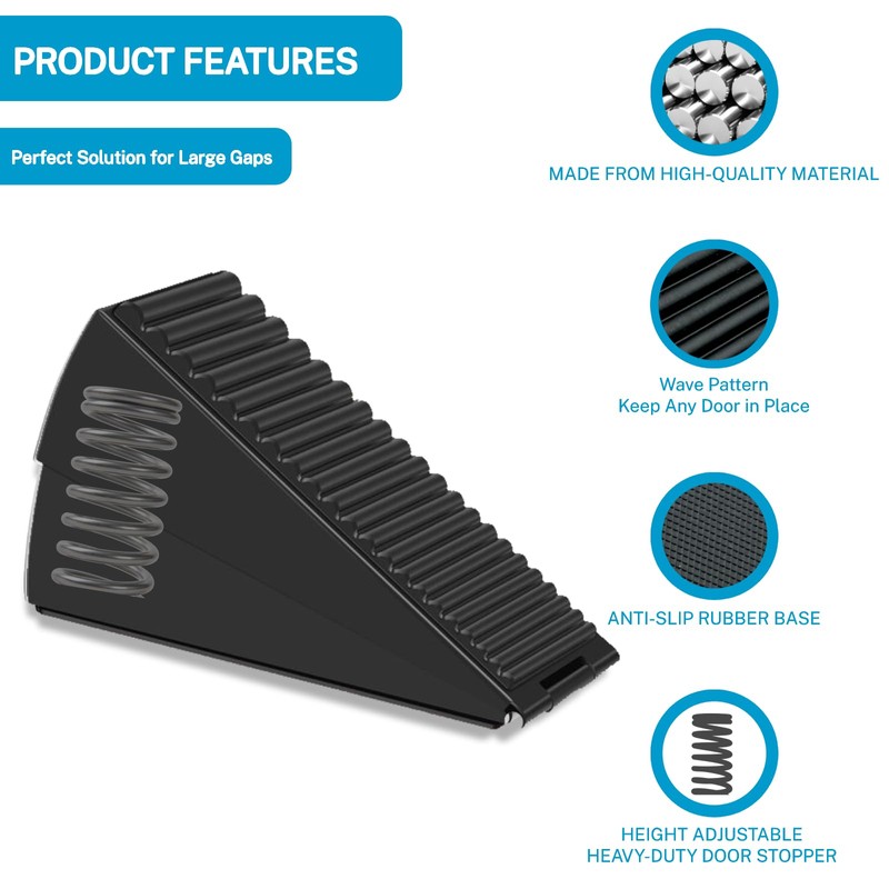 - ⏫Adjustable Design: This tall door stop wedge, standing at 3 inches (75mm), is a spring door stopper that can adjust its height to fit any door gap from 0.4” up to 3". Act as a weighted door stop.