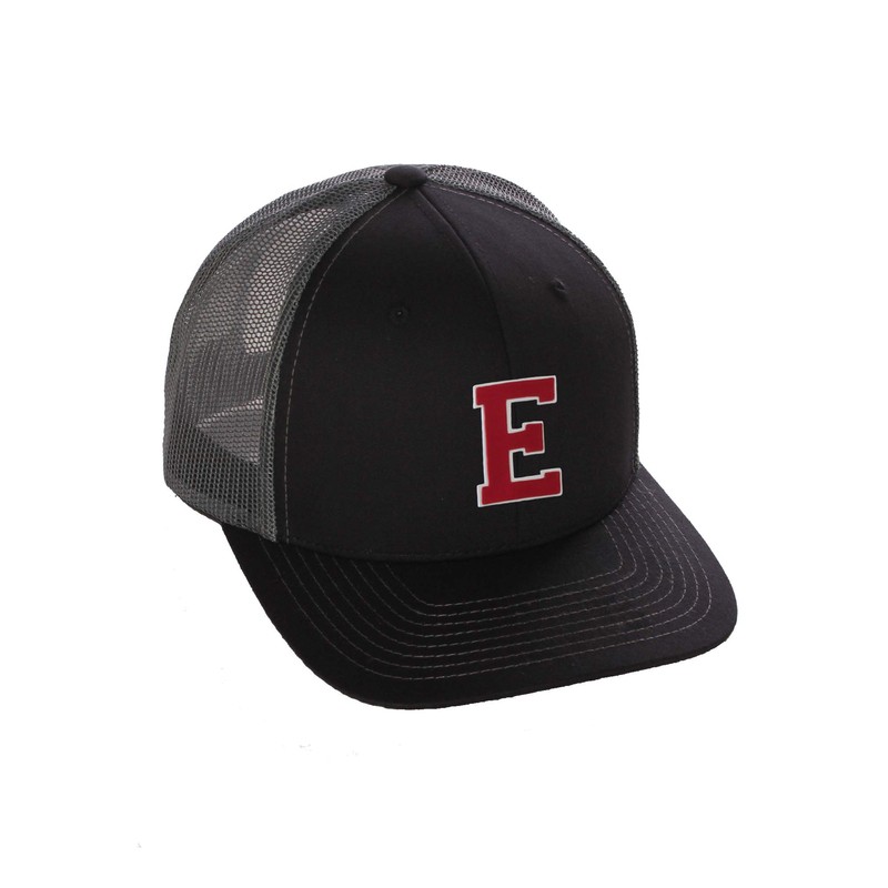 Structured Trucker Mesh Hat Custom Colors Letter E Initial Baseball Mid Profile (Black Charcoal White Red)