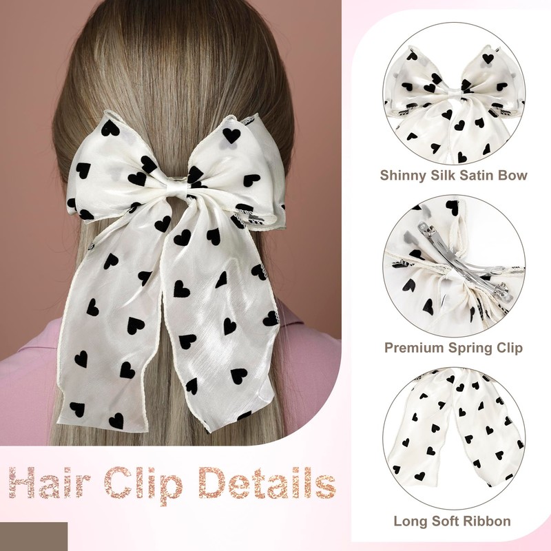 - Elegant Silky Hair Bow: The ribbon bow hair barrette are designed with elegant long tails and exquisite texture, paired with bright finish and stylish white bow with black heart, vivid and classic for women long, short, thick, thin, straight, curly hairstyle decoration needs