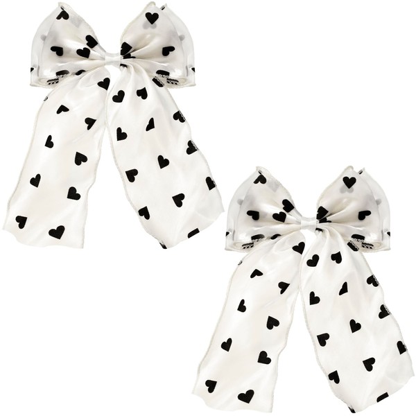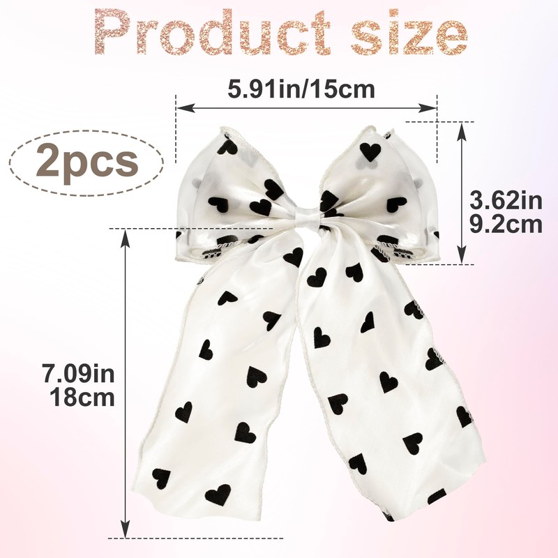 - Large Hair Bow Clips: You will receive 2pcs white hair bow clips with black heart print. Large size design, the bow part size is 5.91 x 3.62 in/15 x 9.2 cm, with 7.09 in/ 18 cm long tail, enough to match your different hairstyle and outfits