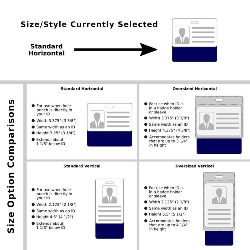 Standard Size: 3 3/8" wide by 3 1/4" tall and extends about 1" below your standard ID badge. Choose this size if you do not use a badge holder (ie a hole is punched directly in your ID badge)