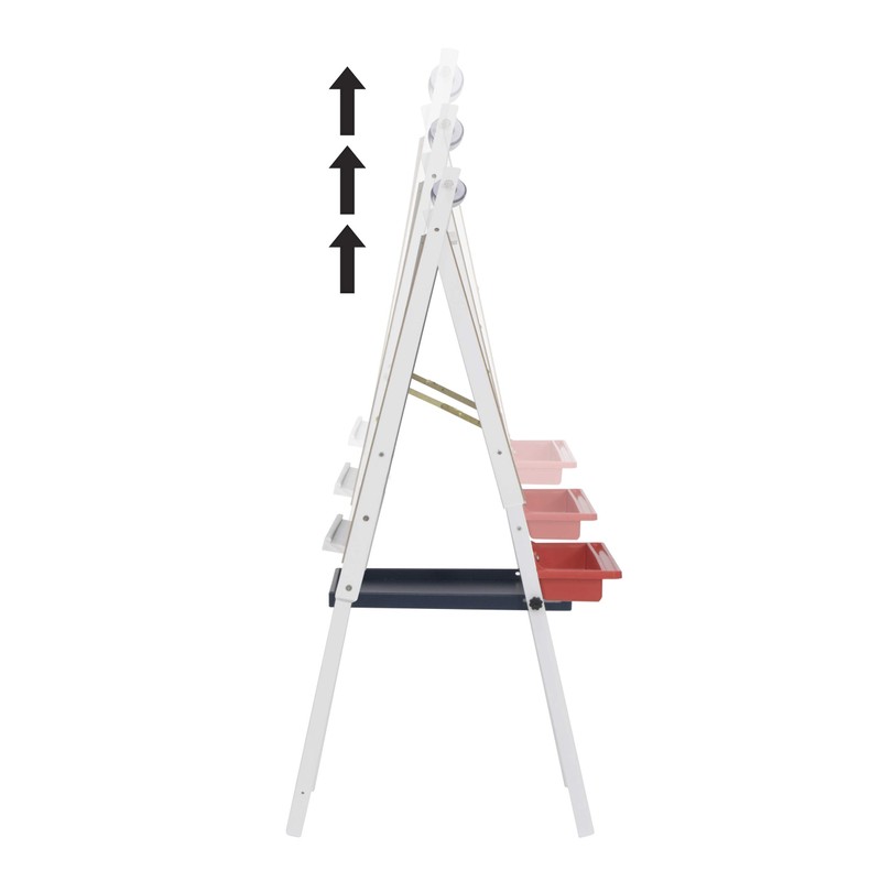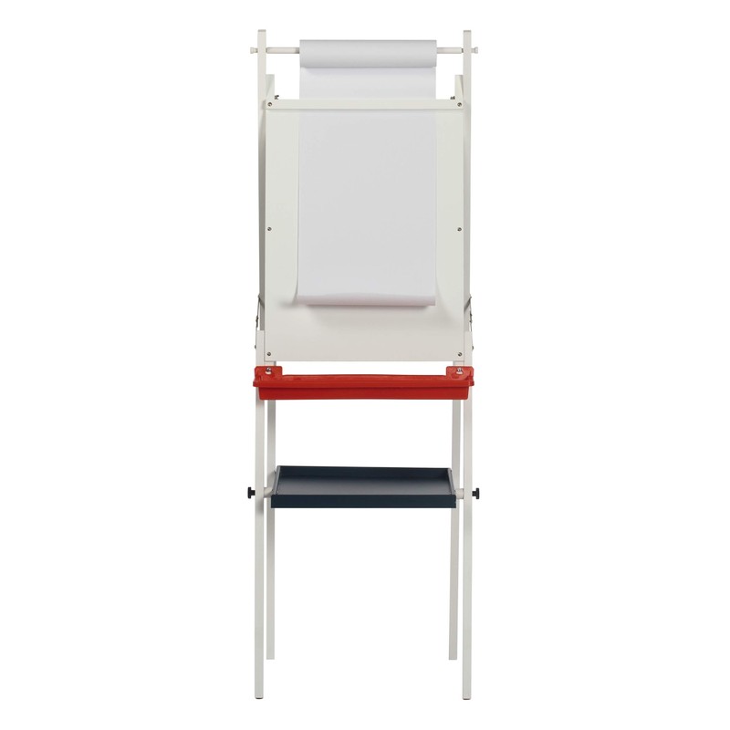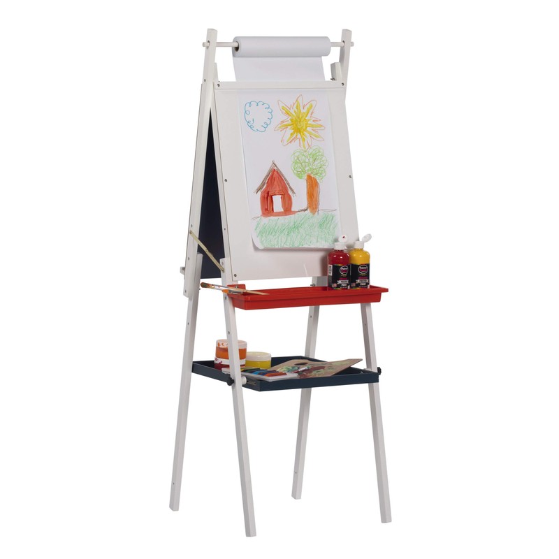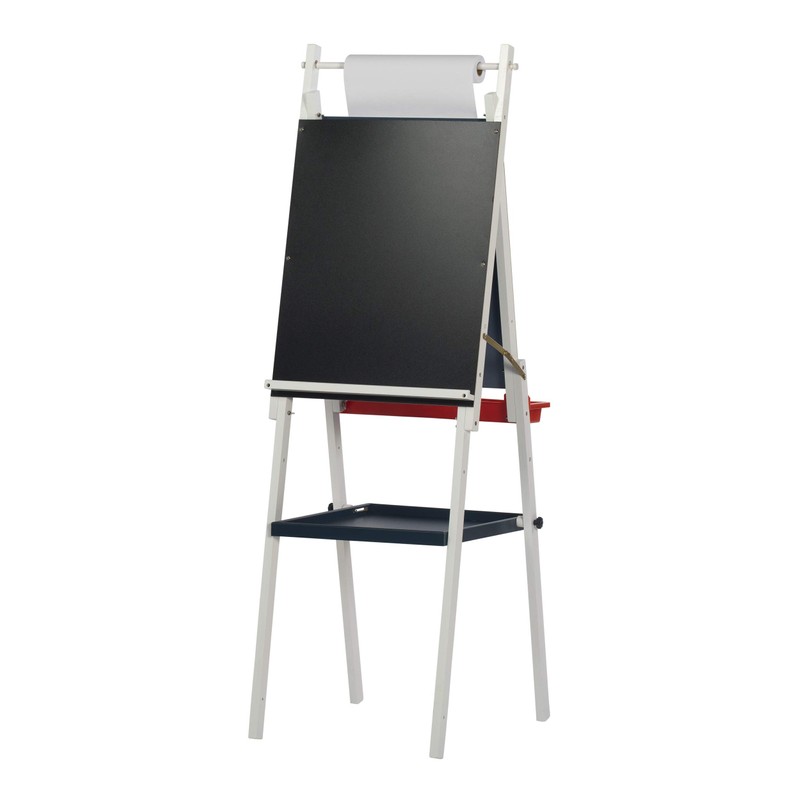 Let youth's imagination flow with Studio Designs' Kid's Easel with Storage. This dual side easel features a dry erase board as well as a heavy duty chalkboard. A mounted dowel above the boards holds paper rolls up to 16'' wide. A removable paint tray allows you to keep those artistic expressions clean and under control. The additional center supply tray is perfect for extra storage space. Can be folded flat for easy storage. Paper roll included. Replacement paper rolls available for purchase (Item #13208). Dry erase board size: 17.25''W x 23''H. Chalkboard size: 18.75''W x 23''H. Overall dimensions: 20''W x 23''D x 48''/52''/56''H.