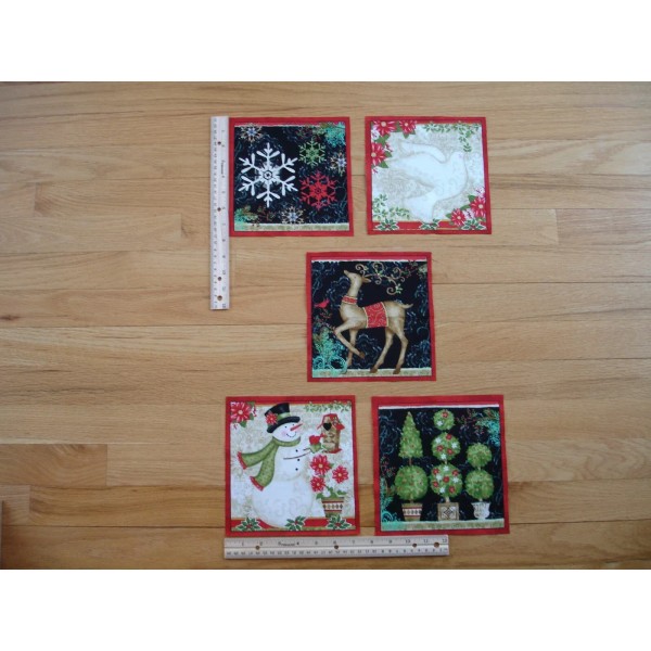 5 Pretty Fabric Blocks, each approx. 7" x 6 3/4" with a Thin Red Border. Comes from a pet and smoke free home.