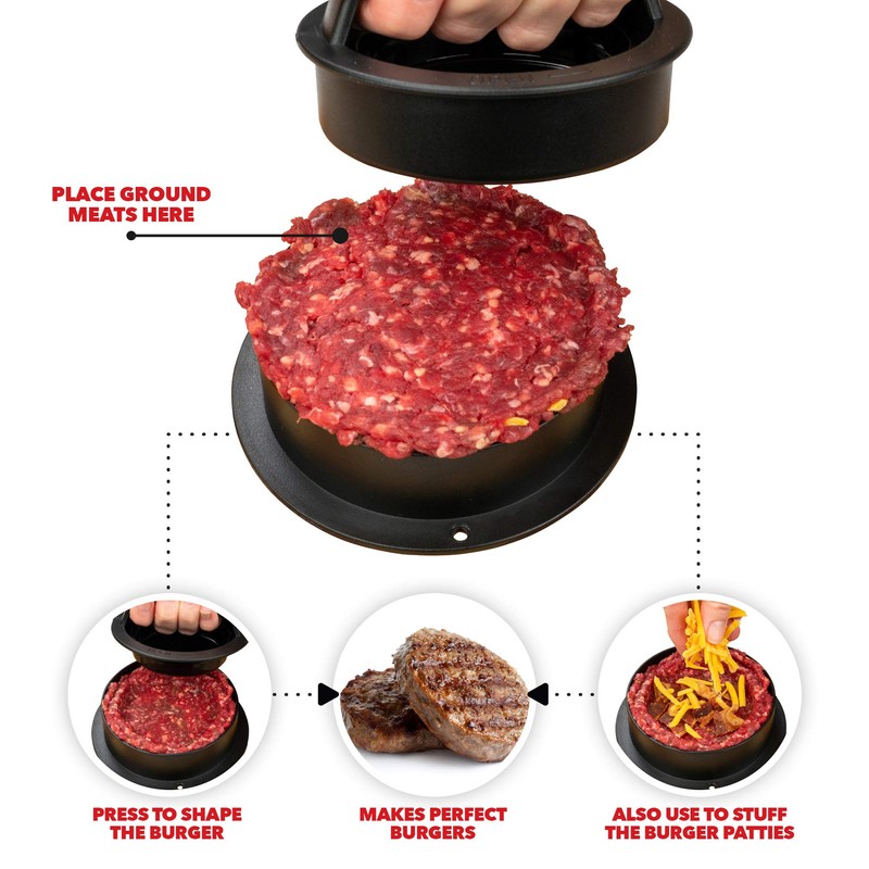 - Simply place patty in the center of the press, add stuffing; Create a unique burger to your likings