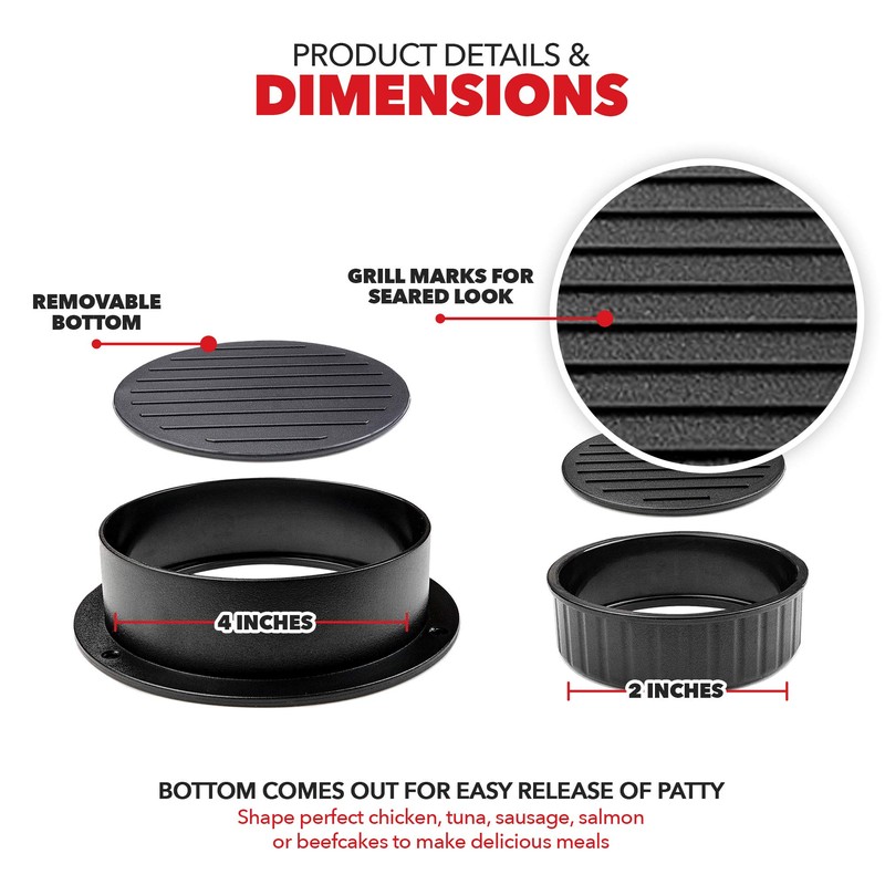 - Inside diameter 2.5- inch slider and 4- inch burger; Top shelf dishwasher and BPA safe burger maker