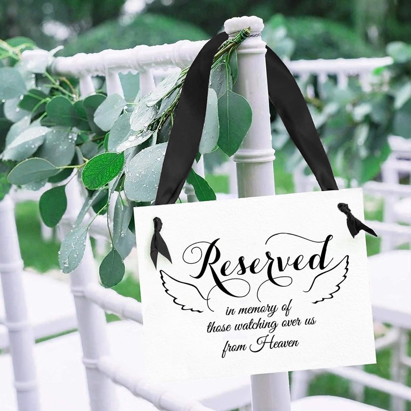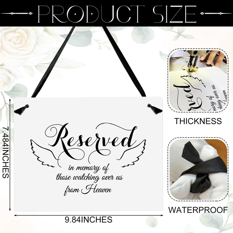 These elegant reserved seating signs are a heartfelt tribute to unbreakable bonds, honoring the eternal love between a groom and his late mother. Crafted from premium, responsibly sourced linen-textured cardstock and finished with a hand-tied satin ribbon, these signs add a personal touch to your wedding decor. Perfect for ceremonies, receptions, reserved seating, or ring bearer displays, their timeless elegance complements all themes and decor styles. Easy to hang with a paired black ribbon, these signs measure approximately 9.84 x 7.48 inches and are ready to use with no customization needed. Display them with pride to celebrate your cherished moments and remember loved ones on your big day.
