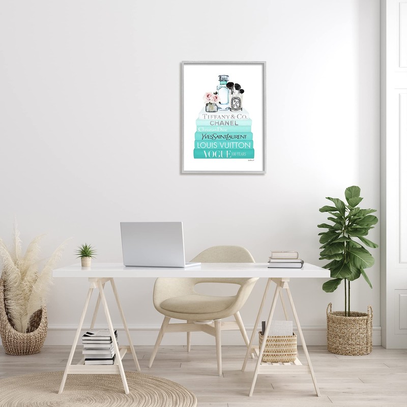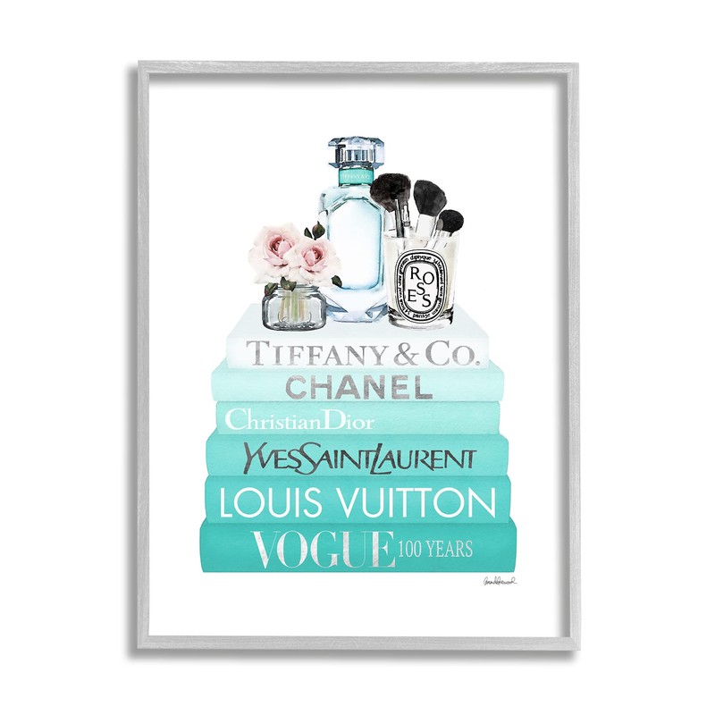 Stupell Industries Glam Fashion Cosmetics Soft Roses Blue Bookstack, Designed by Amanda Greenwood Gray Framed Wall Art, 24 x 30