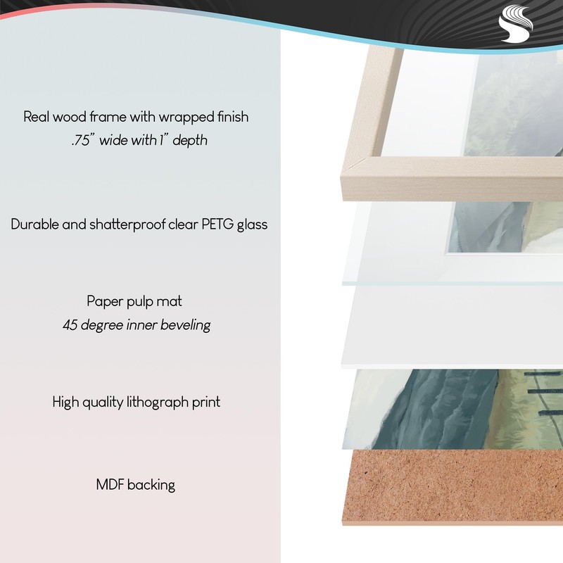 - A digitally printed paper is framed with a white mat under durable PETG plastic. The bevel cut mat is made of paper pulp mat board. The wood look frame includes a pre-installed sawtooth hanger for easy hanging.