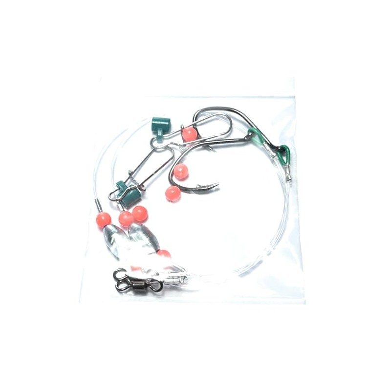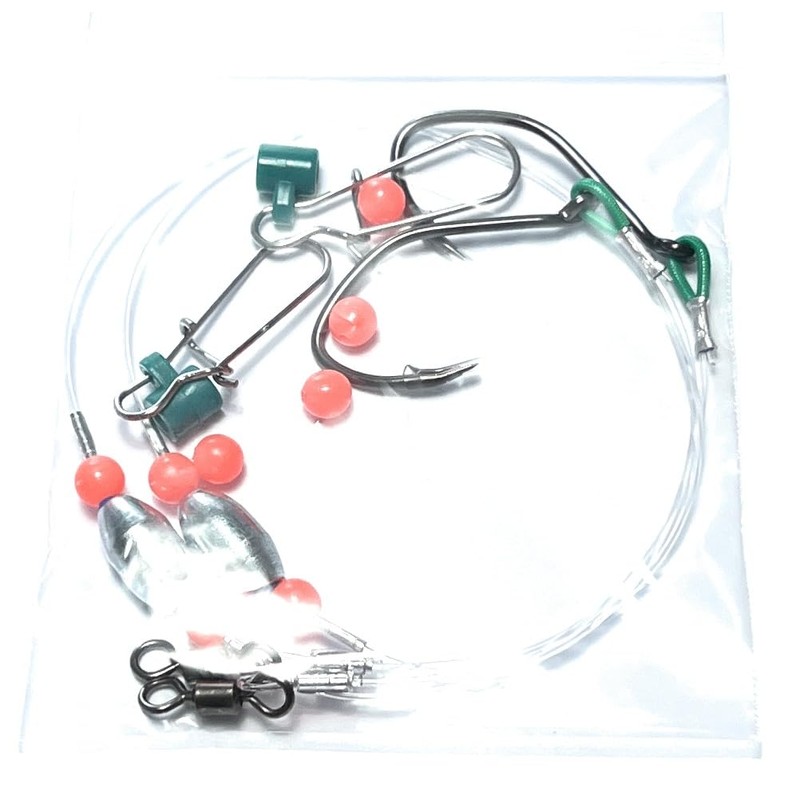 • Top brand name materials very strong and sharp hooks 18" 100 lbs mono leaders 10 gram weight 2/3 down the leader to keep bait on the bottom 2 rigs per pack Includes 2 weight sliders and 4 exta beads