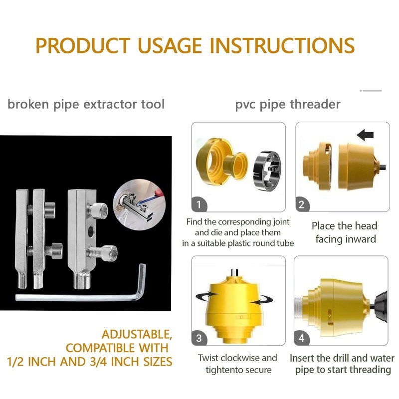 * Portable design for home and outdoor projects. Ideal for quickly threading PVC, plastic, and water pipes. * 12-Piece PVC Pipe Thread Cutter Set: Includes 3 thread cutters for different pipe sizes, a screw extractor for unscrewing broken pipes, gloves, and tape. 12-piece set