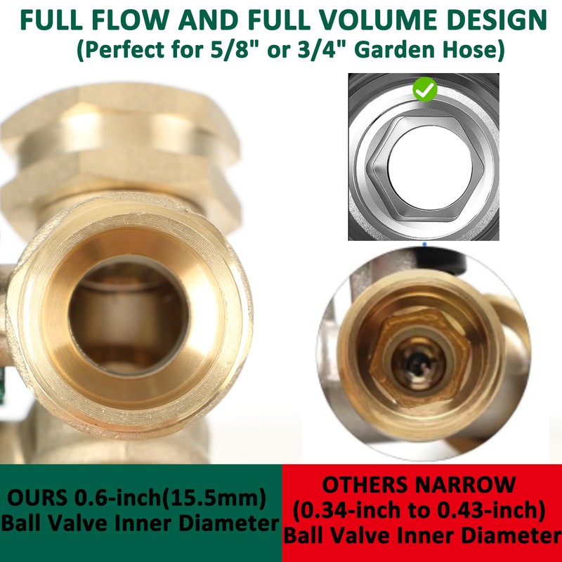- FULL-PORT DESIGN ALLOWS FOR A RESTRICTIONLESS WATER FLOW - This garden hose splitter is designed with a full port ball valve, providing a maximize water flow with almost no resistance. The big ball valve is 0.59 inch in diameter, while the diameter of two outlet ports is 0.81 inch. A straight flow path without becoming narrower, allows the free flow of water, offering more water flow than general garden hose splitter.