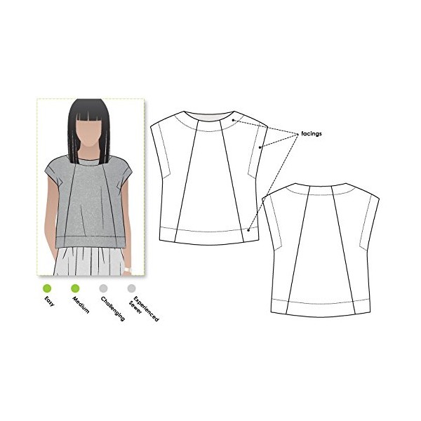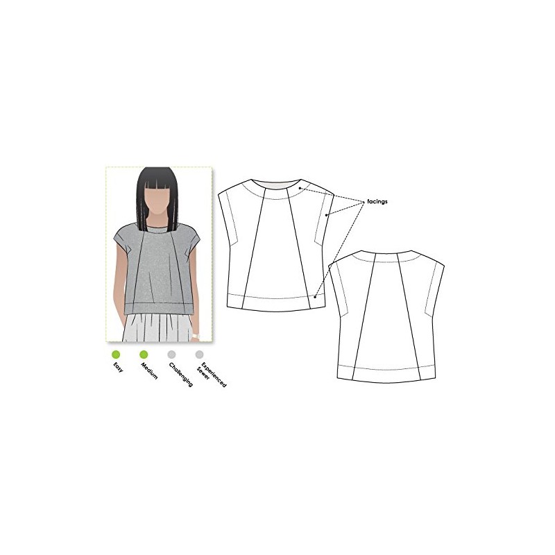 DESCRIPTION: This is a pattern for a designer women's top. This gorgeous boxy shaped top with angled design lines will give your wardrobe a new and fashionable look. The wide facings give this top structure and style. The pattern has been cleverly drafted to cover the top of the arms while not losing any of the design elements. FABRIC SUGGESTIONS: Linen, crepe, silk, light wool. FABRIC ESTIMATE cut two way (WIDTH 110 cm / 44") > sizes 4 -18: 170 cm (1.9 yd) > sizes 20 - 30: 190 cm (2.1 yd)