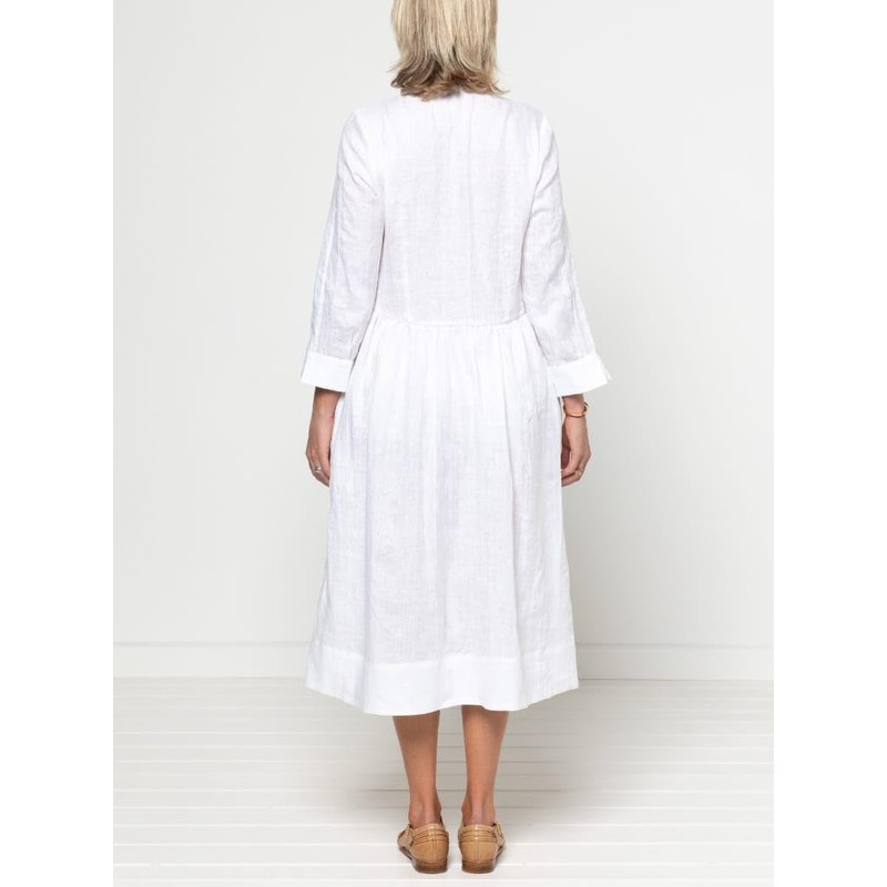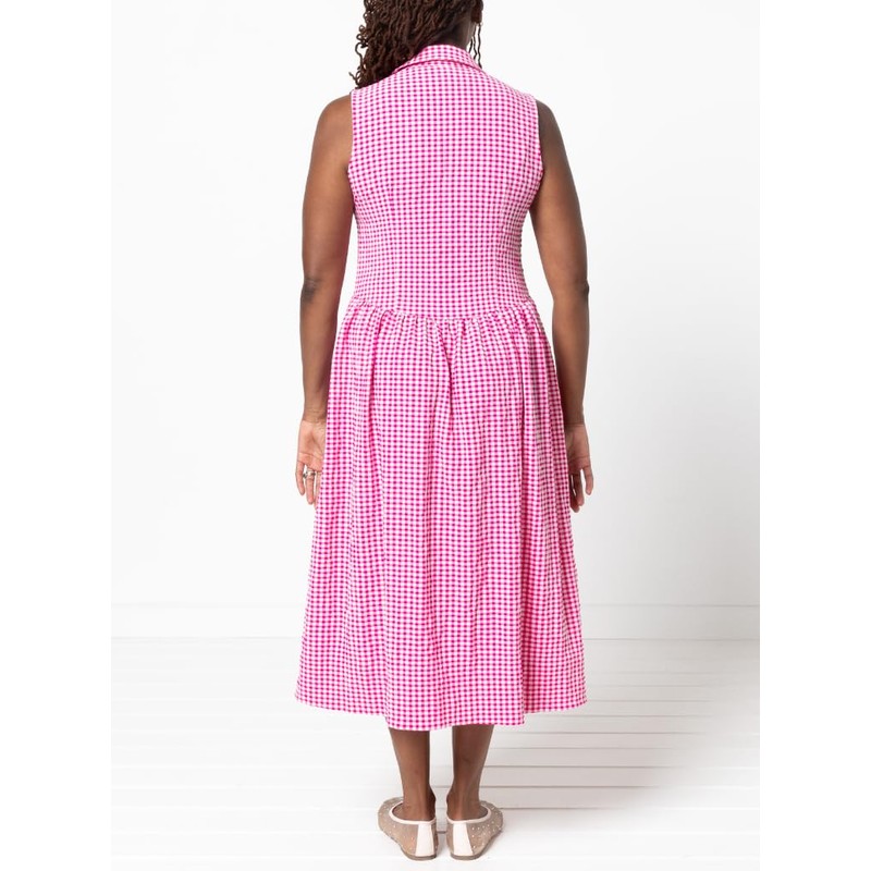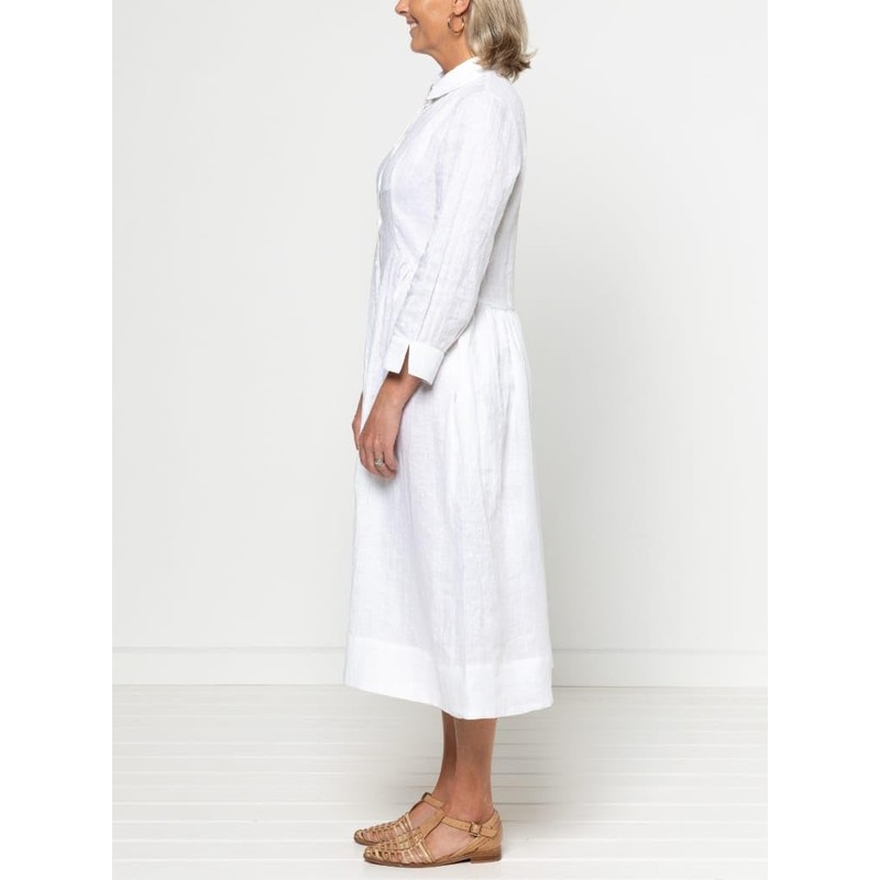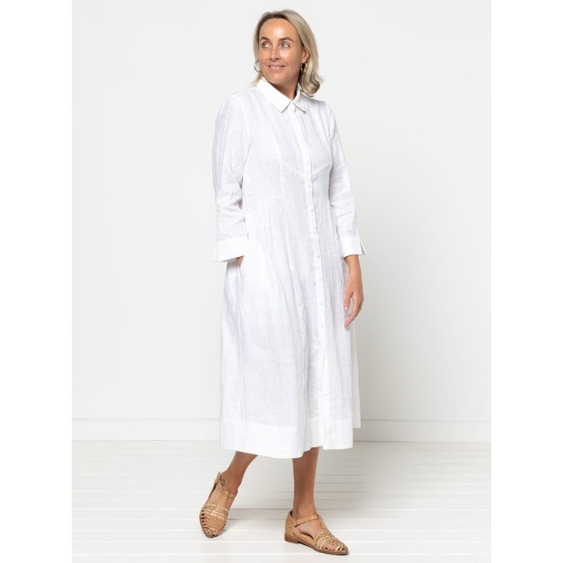 - This is a mid-calf length shirtdress sewing pattern from Style Arc designed for woven fabrics. You will receive a paper sewing pattern with instructions with your purchase. This shirtdress sewing pattern features a mid-calf length, gathered skirt, princess seams, a curved high/low waist seam, centre-front button placket and inseam pockets. You also have the choice of sleeved or sleeveless options. Make this versatile style in linen, cotton poplin, silk or rayon.