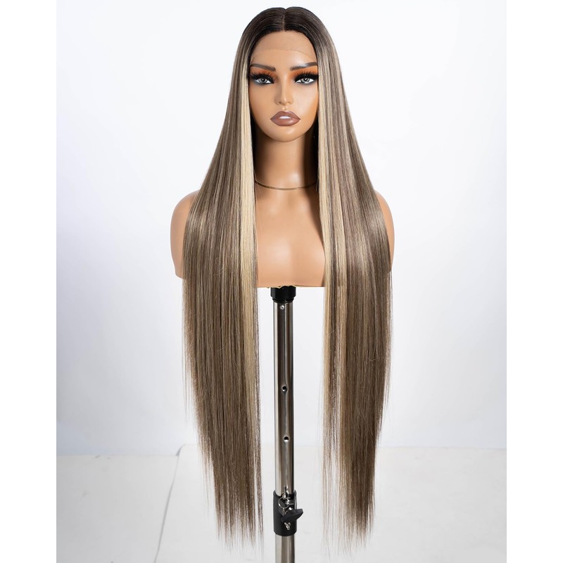 Style Icon Highlight Super Long Straight Lace Front Wig 38 Inches Long Wig for Women Synthetic Lace Front Wig Middle Part Lace Wig Pre Plucked with Baby Hair Heat Resistant Fiber 150% Density