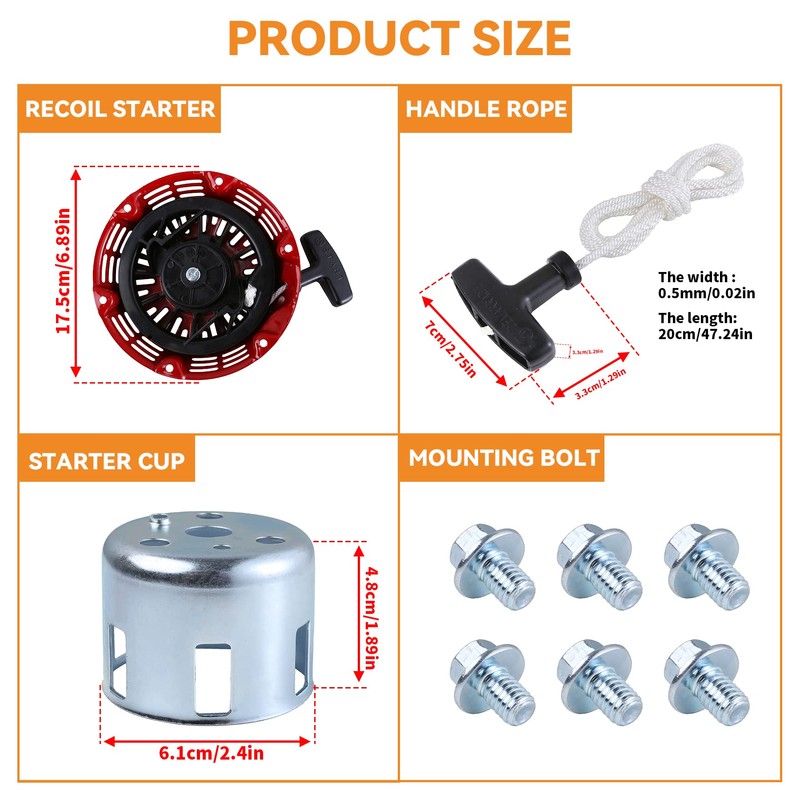 - Package included: 1 x recoil starter,1 x starter cup,1 x Recoil Starter Handle Rope, 6 x mounting bolt