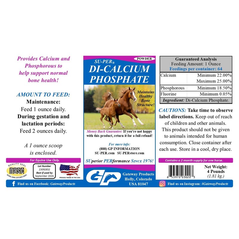 - ESSENTIAL BONE SUPPORT: SU-PER Di-Calcium Phosphate is a source of supplemental Calcium and Phosphorus, minerals necessary for proper bone development in horses.