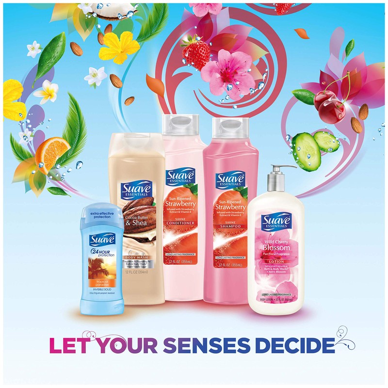 The Suave Essentials Sun-Ripened Strawberry Conditioner has been specially made with a gentle formula to bring out the best in your hair. Enjoy a deep moisturizing experience while the formula works to keep your hair looking healthy everyday. By making this your daily hair conditioner, you'll enhance moisture without weighing your hair down and making it oily. You'll love the way the Suave Essentials conditioner enhances your hair's natural beauty. Achieve the best results from this hydrating, moisturizing conditioner by pairing it with the Suave Essentials Sun-Ripened Strawberry Shampoo, a combination that delivers 2x more moisture vs non-conditioning shampoo. The sweet scent of freshly picked strawberries will leave your hair with a subtle, lingering fragrance after washing. The Suave Essentials shampoo and conditioner range has a variety of options to suit everyone. Experiment with different fragrances, including Everlasting Sunshine, Waterfall Mist, and Aloe Waterlily. Find your favorite fragrance and leave a review at Suave.com. About Suave For over 75 years Suave has offered professional quality products for the entire family, which are proven to work as well as salon brands. The Suave mission is to make gold standard quality attainable to all, so everyone can look good, smell good, and feel good every day.