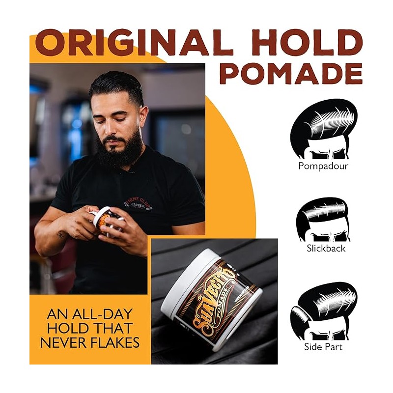 - Esta pomada se adhiere al cabello como la cera, pero es soluble en agua. Se lava igual que un gel para el cabello: ¡lo mejor de ambos mundos! ¡El producto contiene un aroma único pero ligero que ha demostrado ser extremadamente admirable tanto por hombres como por mujeres! Huele muy limpio. Funciona perfectamente en estilos clásicos, modernos, retro y de la vieja escuela con una fijación fuerte que dura todo el día. Agrega un poco de agua durante la aplicación para un peinado que tenga ese aspecto «húmedo». ¡Te alegrarás cuando descubras la facilidad con la que este producto se lava en la ducha! Disponible en tarrinas de 4 oz y 32 oz. Fabricado en EE. UU.