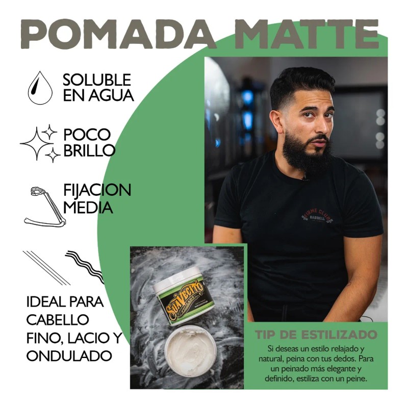 Esta increíble fórmula te va a proporcionar una fijación única y un acabado mate. Nuestra pomada se deslizará en tu cabello sin esfuerzo y de forma limpia permitiéndote peinarte con total facilidad. Esta pomada mate tiene un gran poder de permanencia, pero se elimina sólo con agua. Es todo lo que conoces y amas de Suavecito Pomade en un acabado completamente mate.