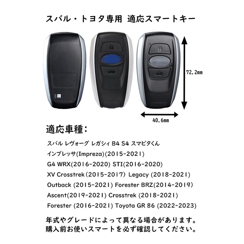 - [Compatible models] SUBARU Revolg Legacy B4 S4 S4 Sumapita-kun Impreza (Impreza) (2015-2021) G4 WRX (2016-2020) STI (2016-2020) XV Crosstrek (2015-2017) back (201) 5-2021) Forester BRZ(2014-2019) Legacy (2018-2021) Ascent(2019-2021) Crosstrek (2018-2021) Forester (2016-2021) Toyota GR 86 (2023) for use. ※The shape of the smart key may differ depending on the grade and year, so please make sure to check the shape of your smart key. If you are not sure about it, please feel free to contact us. If the product you received does not match with your key, please contact customer service as soon as possible!