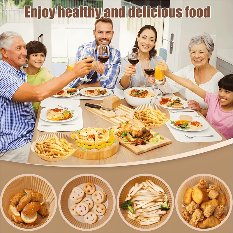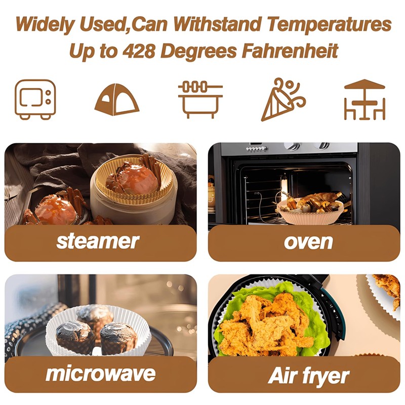 These 100 pieces disposable paper pads for hot air fryers are non-stick, very heat resistant, can withstand temperatures up to 230 C and have an inner diameter of approx. 16 cm.