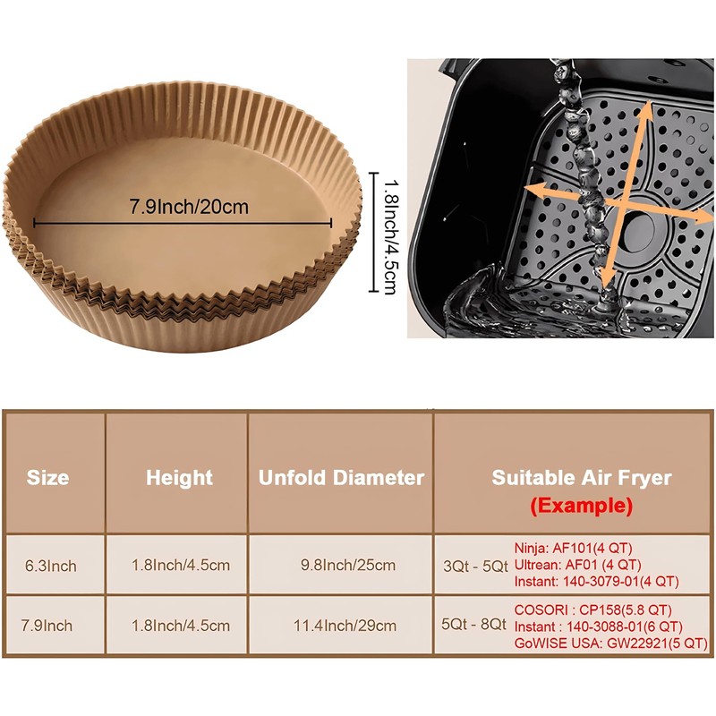 - Widely used: inner diameter 16 cm, diameter 20 cm, height 4.5 cm. Suitable for 3-5L hot air fryers. Whether you're grilling meat, grilling vegetables, roasting chicken wings or making desserts, this parchment paper is perfect for all your cooking needs. It is not only suitable for hot air fryers, but also for kitchen appliances such as ovens, microwaves etc. to make your cooking world more colourful.