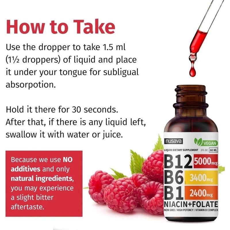 - Rapid Sublingual Absorption - Our Liquid B12 Drops are designed for efficient sublingual absorption. Just place the drops under your tongue for 30secs and swallow the remaining liquid. Quick and easy!