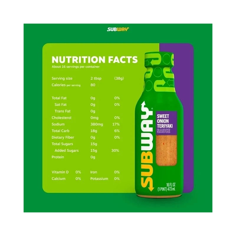 - EAT FRESH AT HOME: Made with ginger, poppyseed and green onion, Subway Sweet Onion Teriyaki Sauce brings home the flavor you love. With only 80 calories per serving, a better choice just got easier to make.