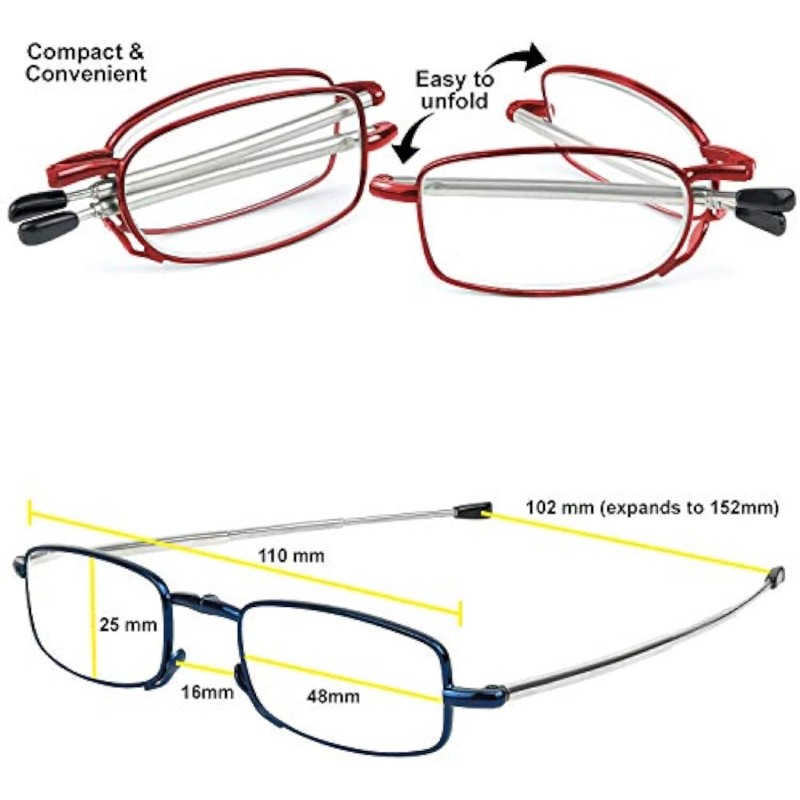 Success Eyewear brings you this great set of folding reading glasses. Set includes 2 pairs for your convenience in two popular colors: blue and burgundy. These glasses are suitable for both men and women. Keep a pair in your favorite reading spots so you always have one handy.