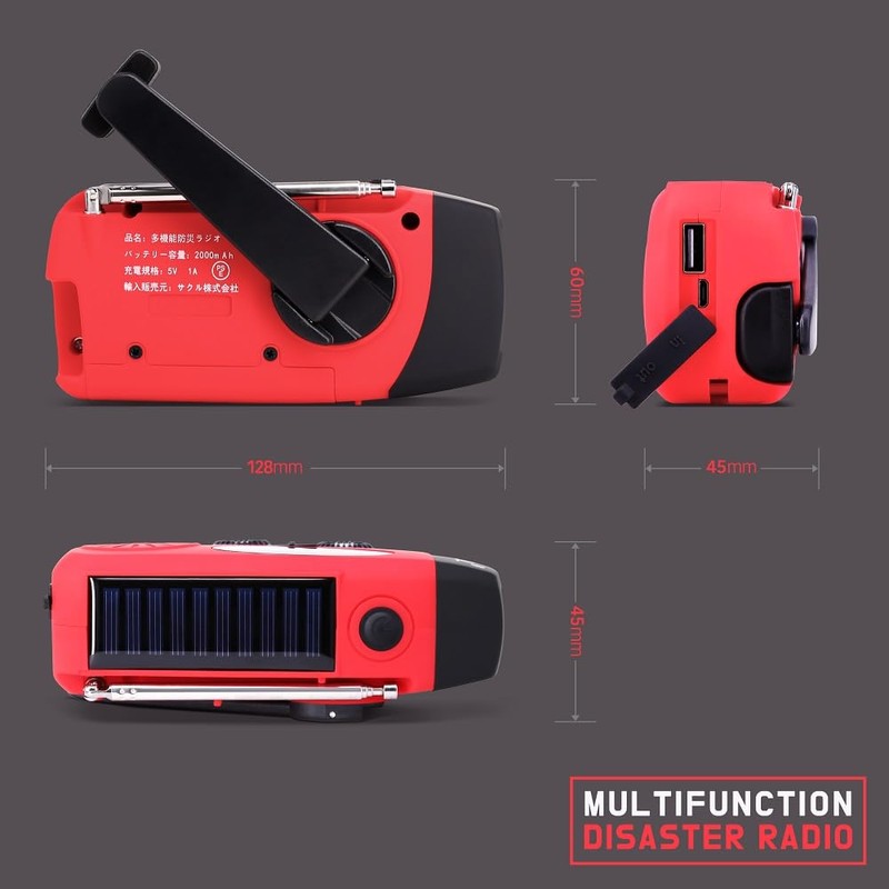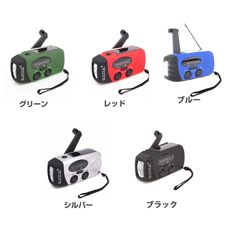 SUCCUL Multi-functional Disaster Prevention Radio, AM/FM Compatible, Disaster Prevention Flashlight, Large Capacity, 2,000 mAh, Smartphone Charging Function, Solar, USB Charging, Hand Crank, 3