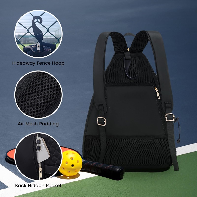 - HIDDEN ANTI-THEFT POCKET AND HOOK HENCE ☛ The top of the pickleball bag has a heavyweight plastic fence hook, which tucks away when not in use. This allows you to easily keep the bag safely off the ground.When carried as a backpack, the hidden pocket on the back keeps items on your back so pickpockets can't reach the contents. Great for protecting a wallet or cell phone. On the left hand side is a roomy water bottle pocket with a cord lock to keep it from falling out.