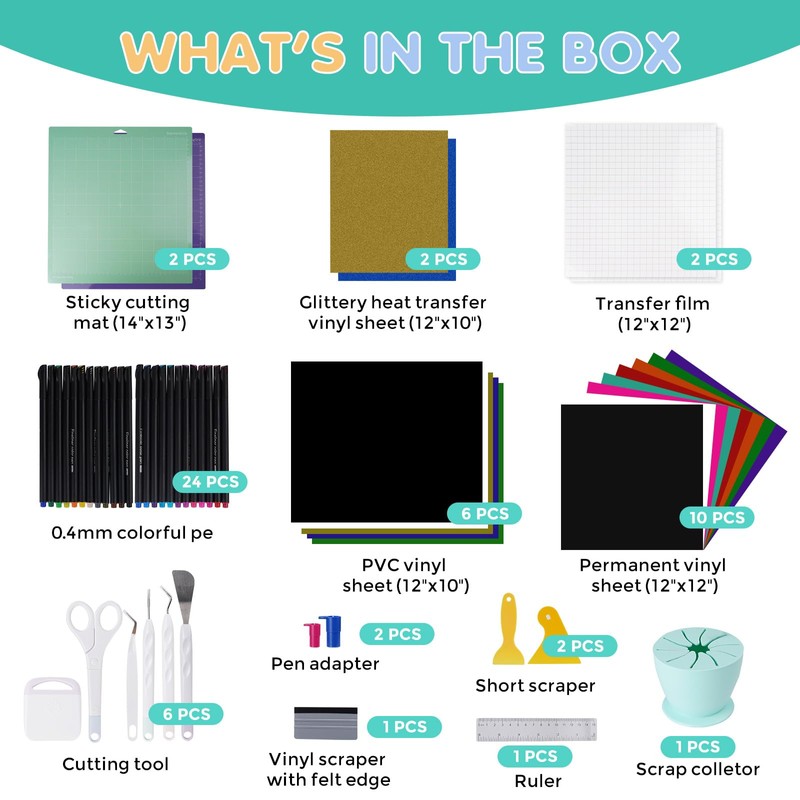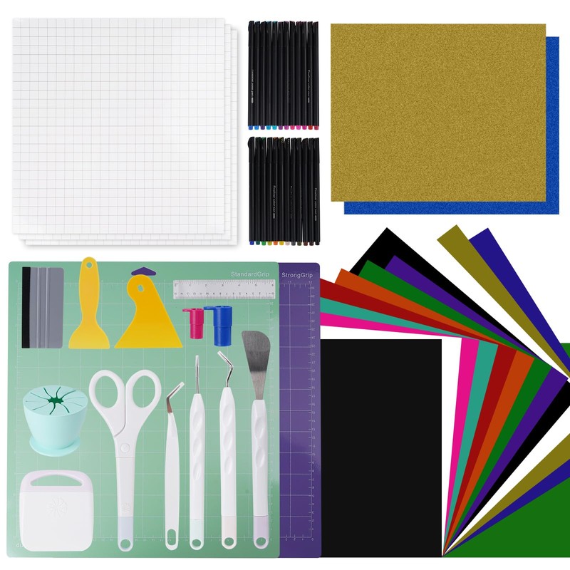 - Ultimate Accessories Bundle for Cricut Makers: Our all-in-one craft kit could bring you all DIY cricut craft needs including decorations. The abundant kit includes Weeding tool 8-piece set,2 sticky cutting pads,24 pens,2 adapters+1 long scraper+2 short scraper+1 ruler,10 permanent vinyl,2 transfer film,2 flash heat transfer vinyl,5 PVC vinyl.