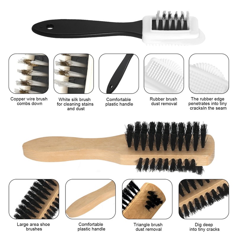 - Suede brush set: you will receive 1 suede brush, 2 shoe brushes, 1 four-sided scrub brush and 1 trainer eraser. The trainer brush is perfect for cleaning and caring for different parts of your shoes and meets all your shoe polishing needs and is also suitable for fine cleaning and care of the car interior.