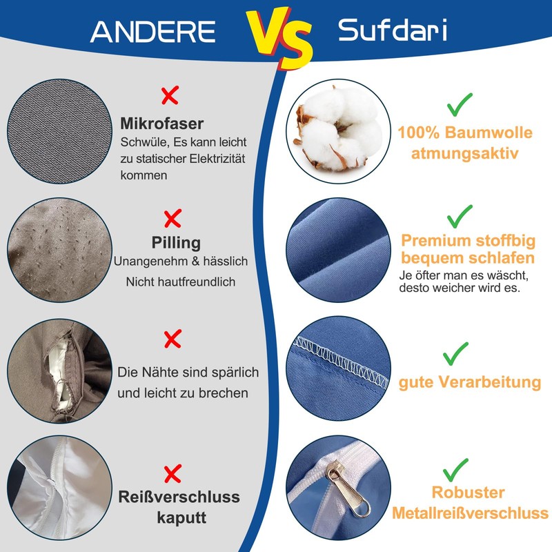 The cotton bed linen from Sufdari is just the thing for a restful sleep. The cotton bedding set is breathable and super soft. Thanks to the good quality, you can look forward to a long service life of the bed linen. The sturdy zip ensures that the bedding stays well and securely on your bed. With the cotton bed linen from Sufdari you can be sure that you will have a good and restful sleep. Duvet cover set includes one duvet cover and one pillowcase. The cotton ensures a comfortable fit and a particularly cuddly feeling. This bedding is perfect for anyone who values quality and wants to enjoy a restful sleep. These bedding sets are available in various sizes and suitable for all types of beds. Sufdari cotton bed linen is the perfect choice for anyone looking for good quality and a restful sleep. Order today and enjoy the benefits of this high-quality bed linen.